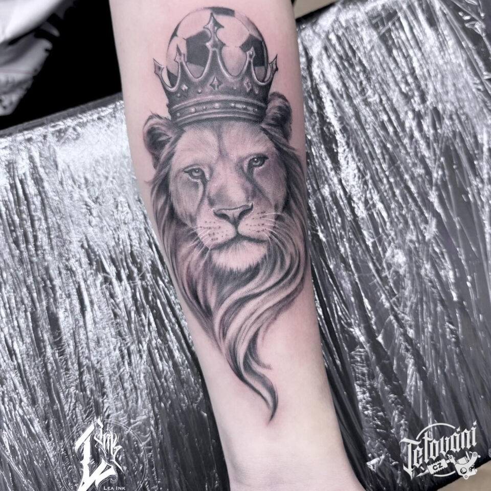 Tetování zvíře, lev znamení zvěrokruhu, lev s korunou na předloktí