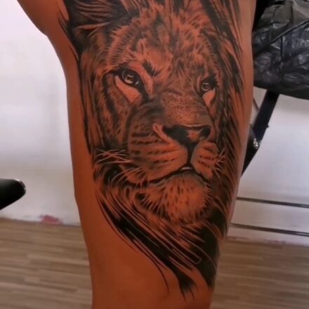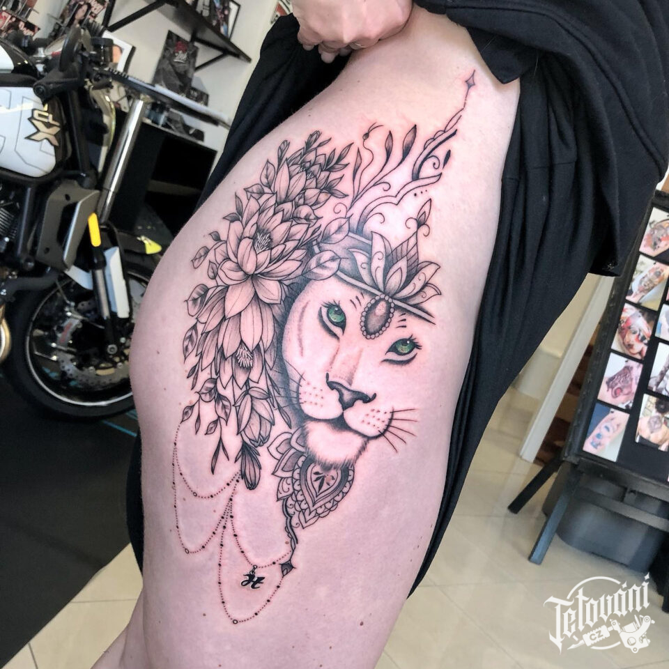 Tetování zvíře, lev znamení zvěrokruhu na boku stehna