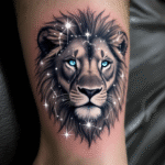 Tetování zvíře, lev znamení zvěrokruhu, souhvězdí lva na lýtku