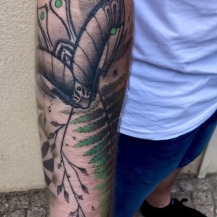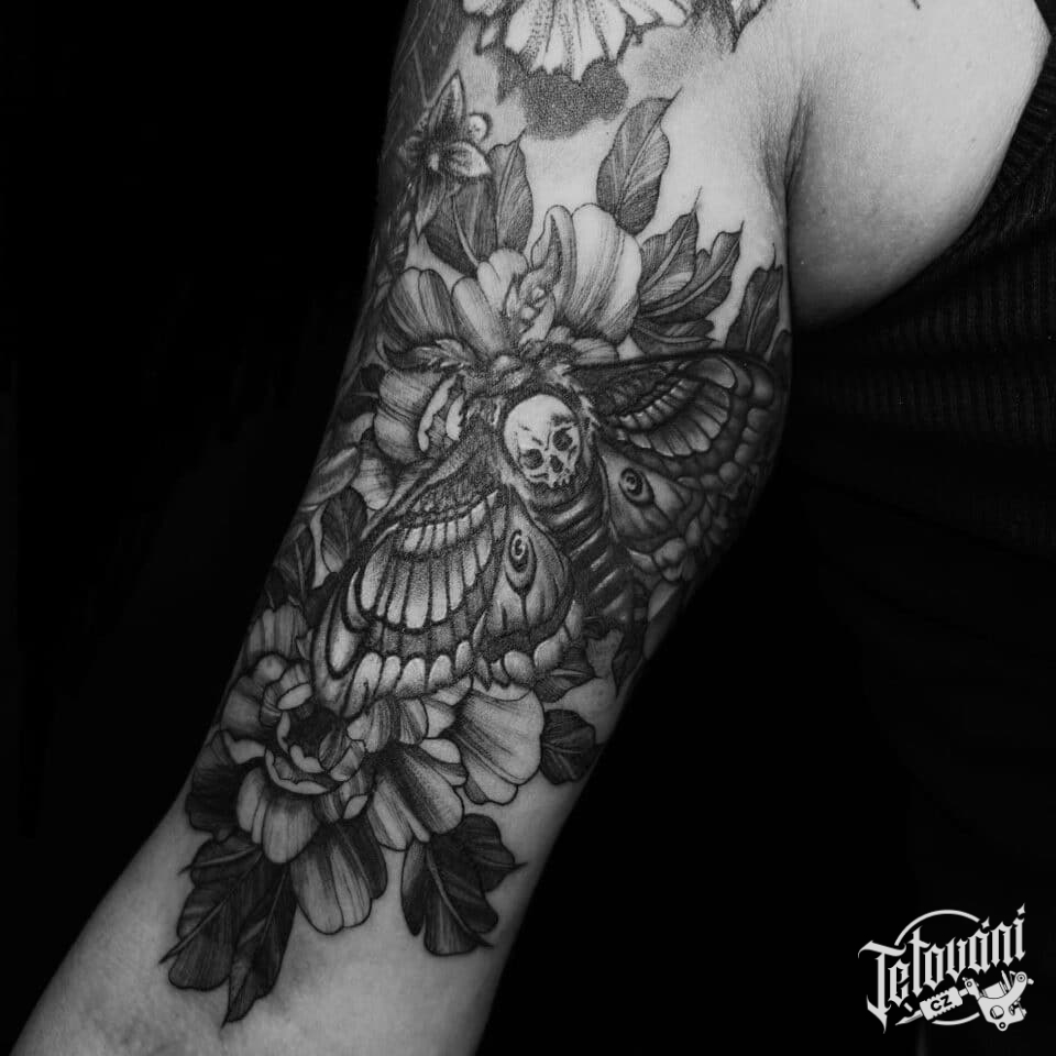 Tetování zvíře lišaj smrtihlav, květiny na paži