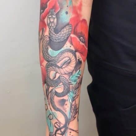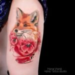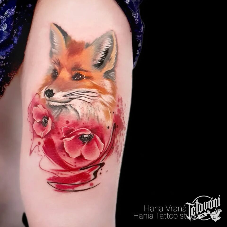 Tetování zvíře, liška a vlčí máky na stehně