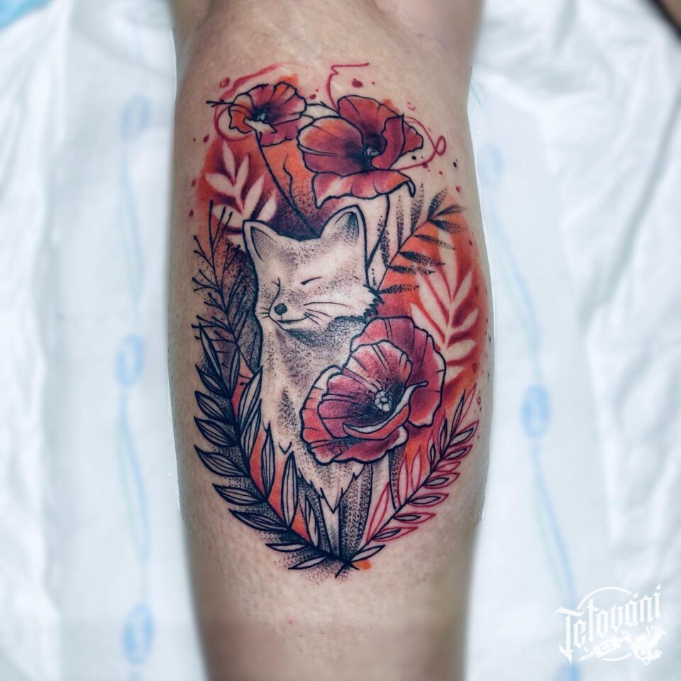 Tetování zvíře liška, vlčí mák, květina na lýtko