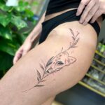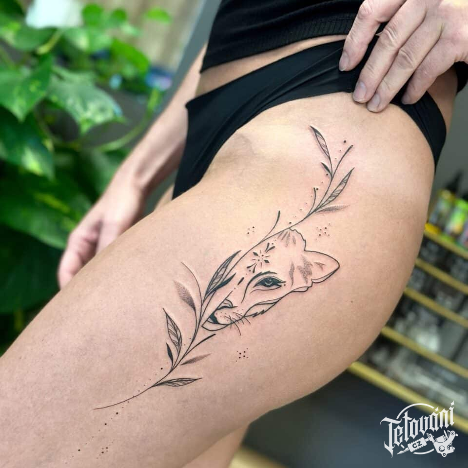 Tetování zvíře lvice, luční kvítí na bok stehna