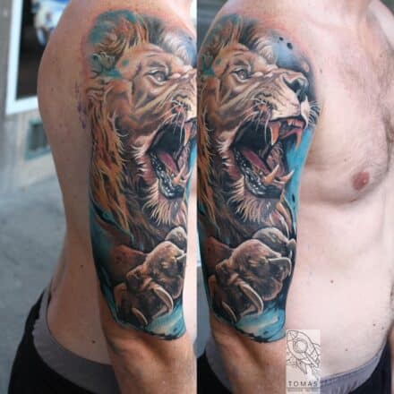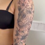 Tetování zvíře, lvice s květinami na rameni