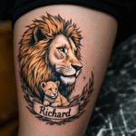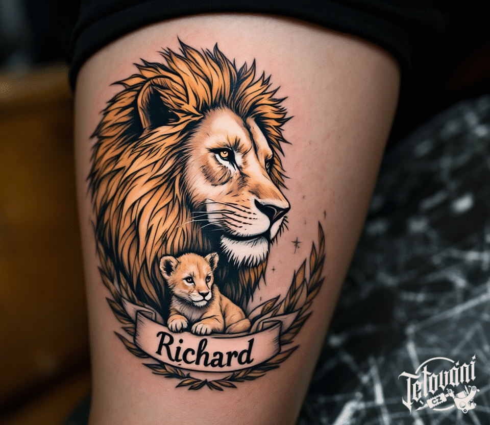 Tetování zvíře lvice, syn s nápisem, jméno dítěte na stehno