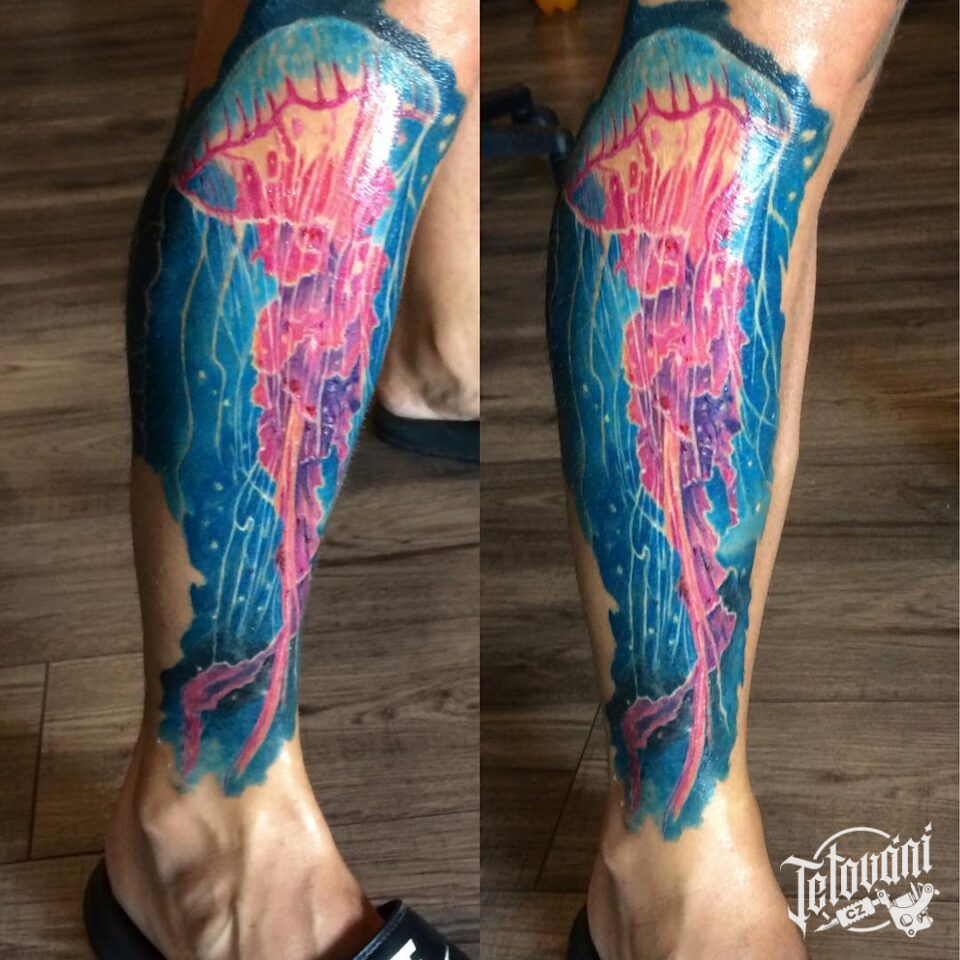 Tetování zvíře, medúza na lýtku