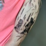 Tetování zvíře medvěd a vlk v lese, příroda na rameno
