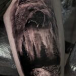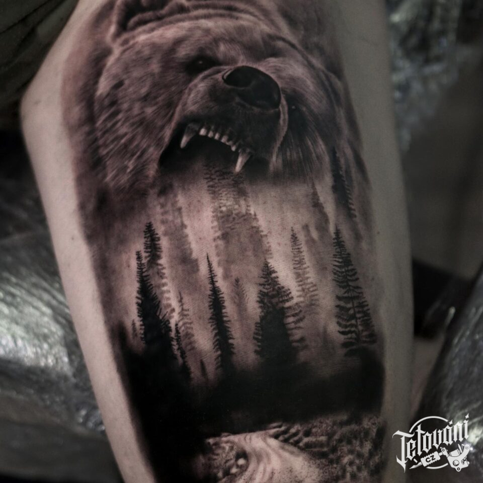 Tetování zvíře medvěd, příroda les na stehno