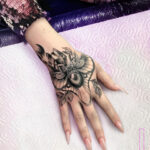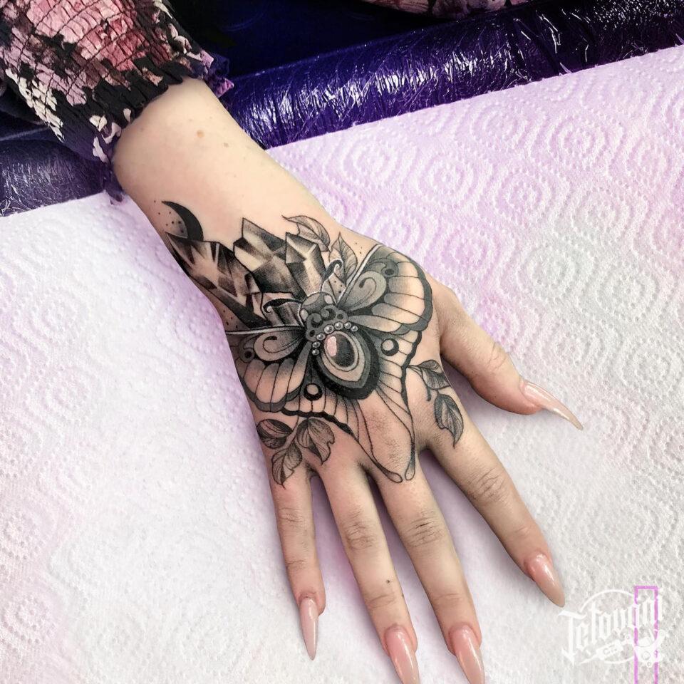 Tetování zvíře, motýl a diamanty na hřbetu ruky