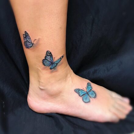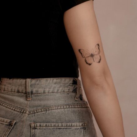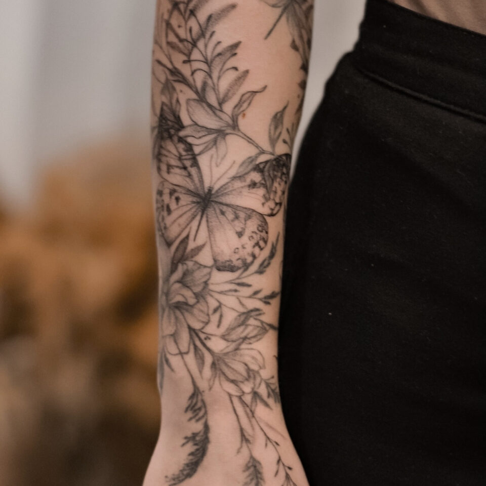 Tetování zvíře motýl a květiny na předloktí