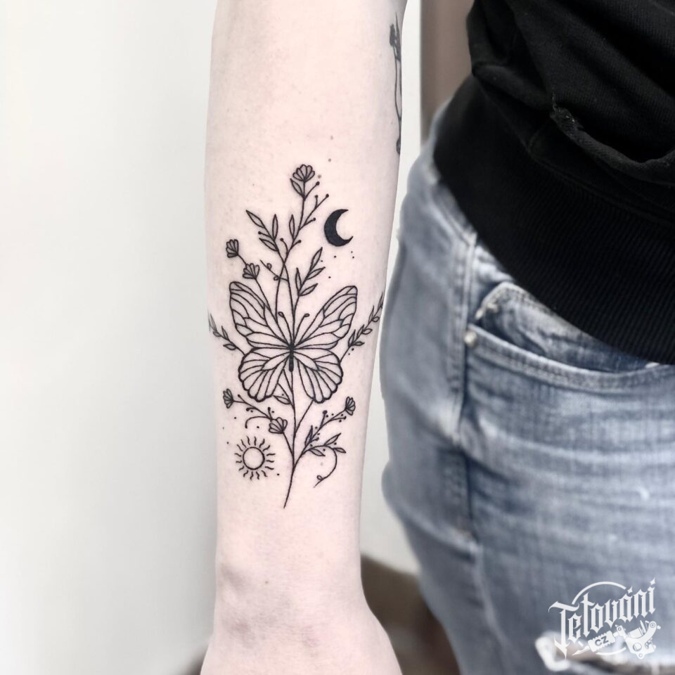 Tetování zvíře motýl, květiny na předloktí
