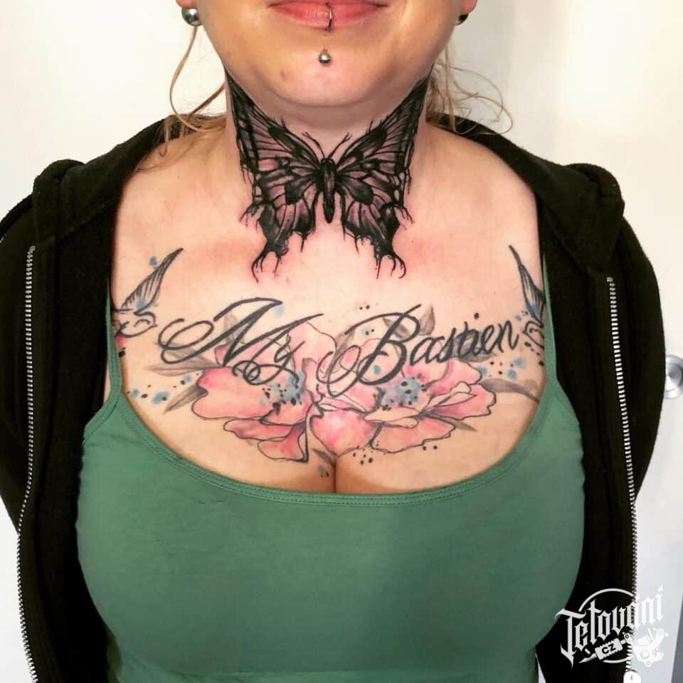 Tetování zvíře motýl, květiny, nápis na hrudník a krk