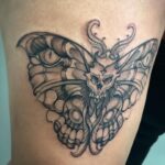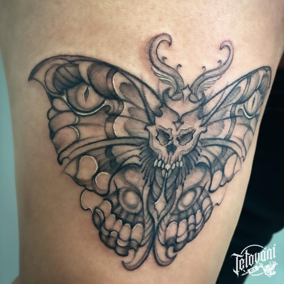 Tetování zvíře, motýl lišaj smrtihlav na stehně