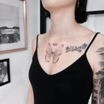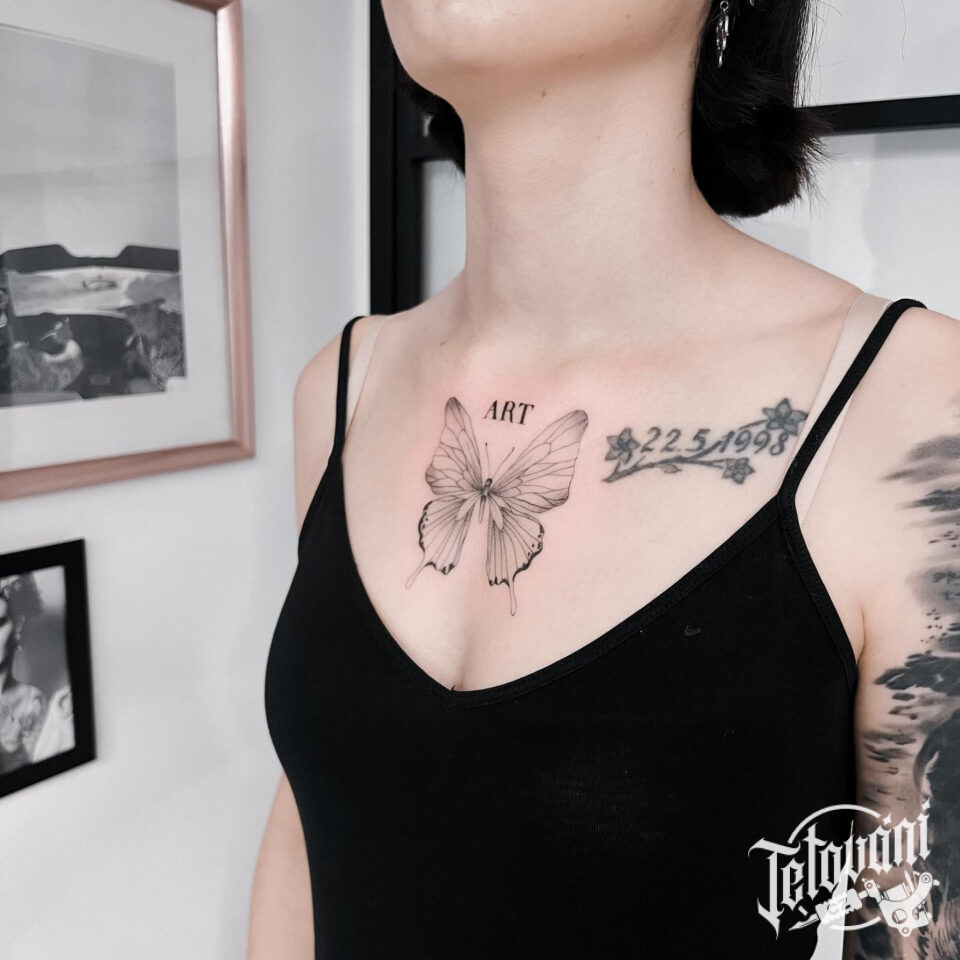 Tetování zvíře motýl, nápis na hrudník