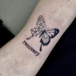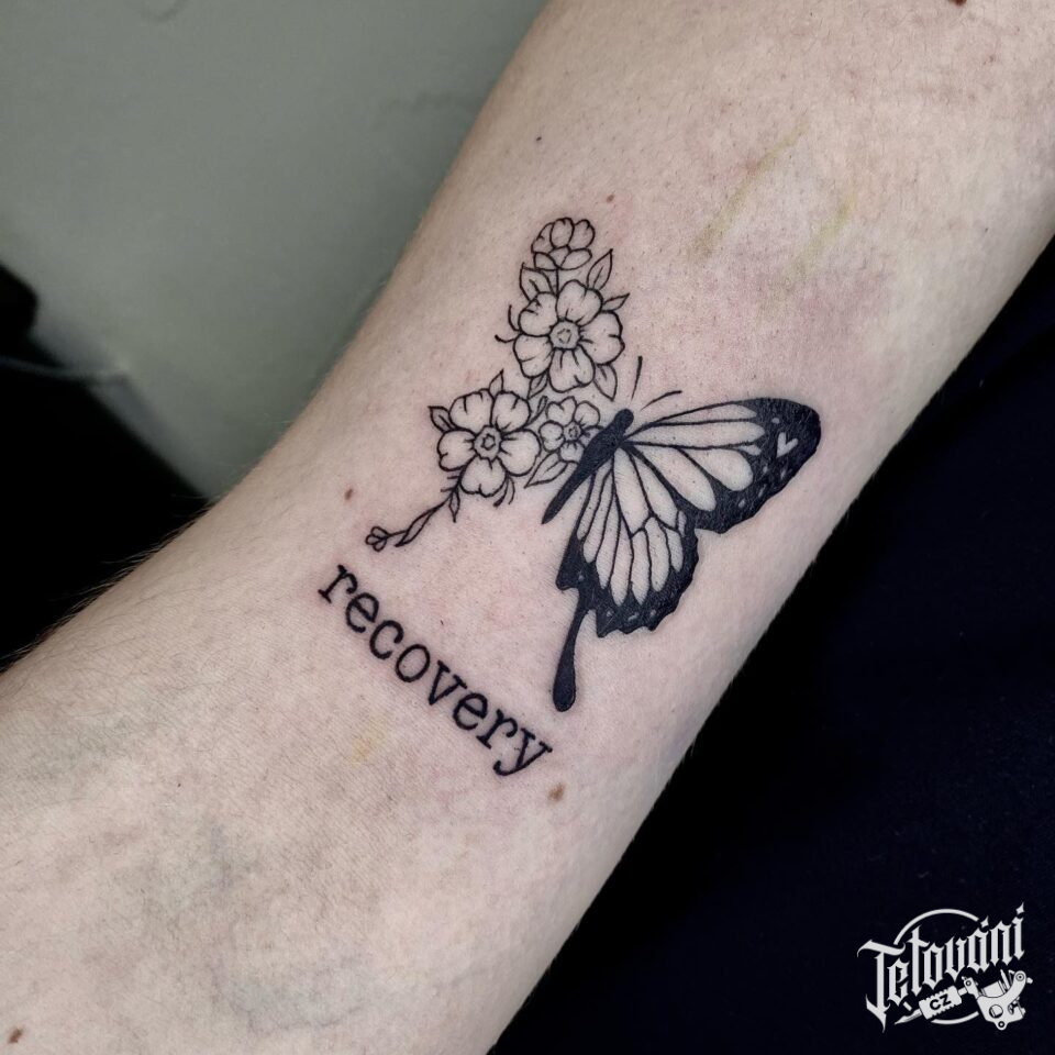 Tetování zvíře motýl, nápis na předloktí