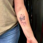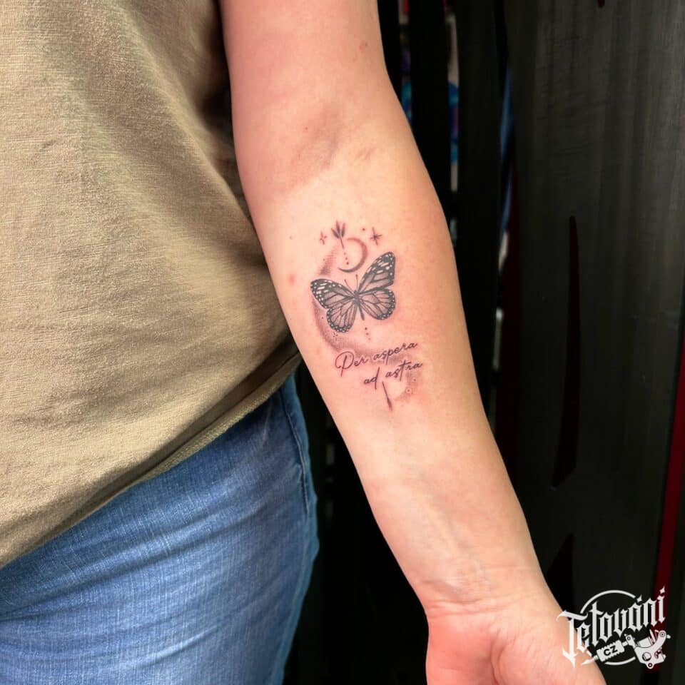 Tetování zvíře motýl, nápisy, písmena, symboly na předloktí