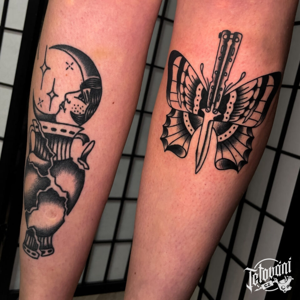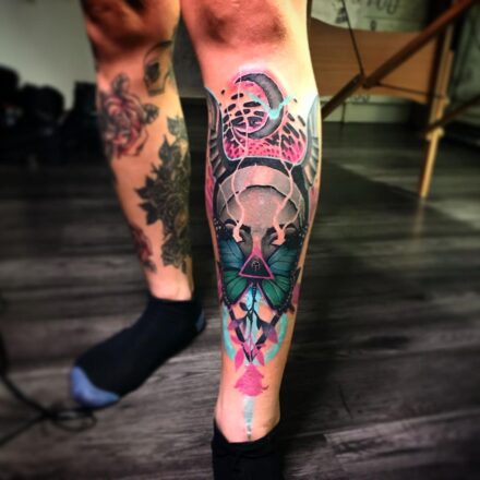 Tetování zvíře motýl, předmět váza a měsíc na lýtka