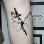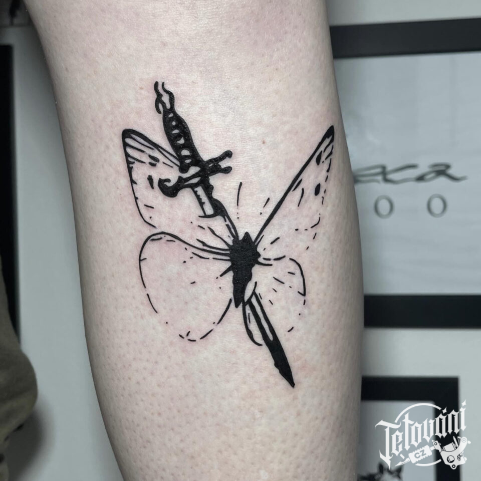 Tetování zvíře motýl probodnutý mečem na holeň