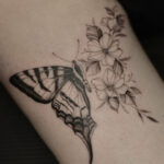 Tetování zvíře, motýl s květinami na stehně