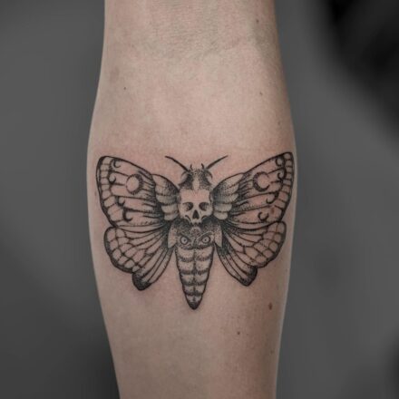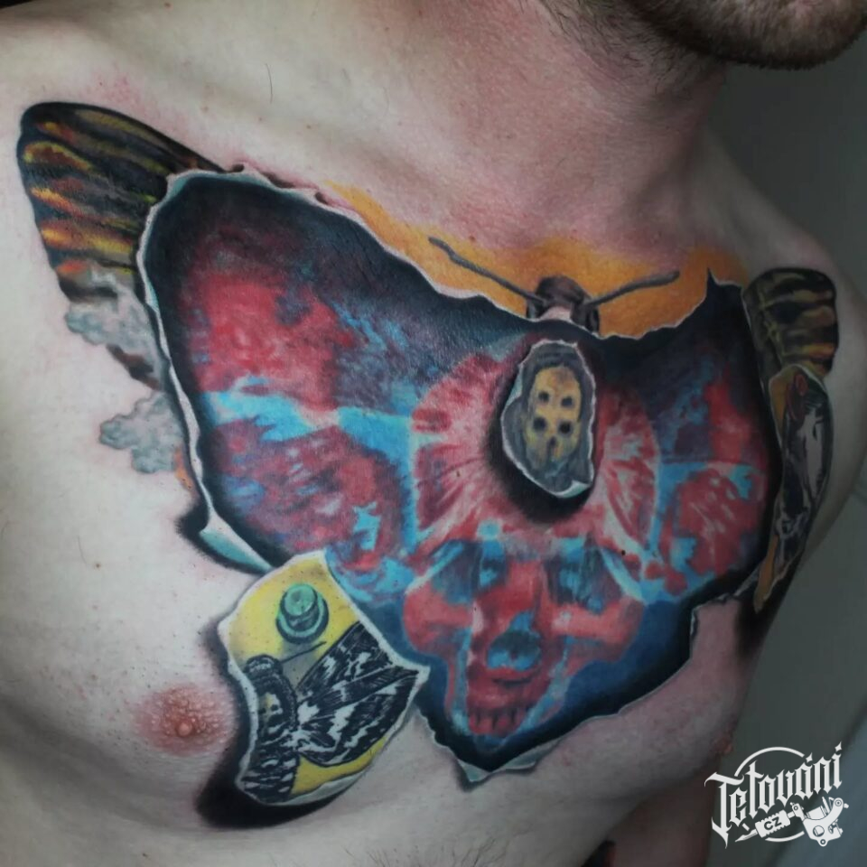 Tetování zvíře, motýl, smrtihlav na hrudi