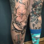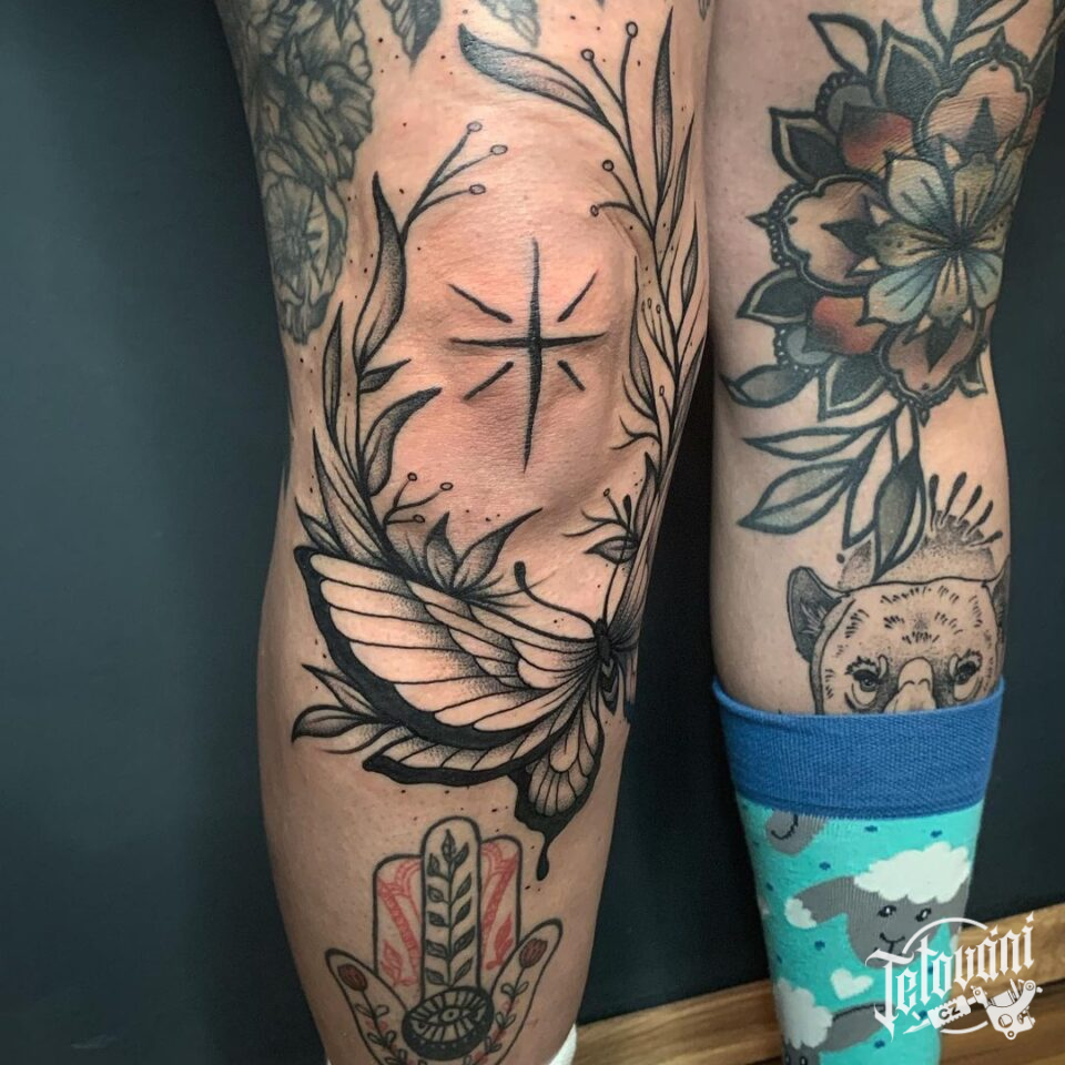Tetování zvíře motýl, znaky a symboly, květiny na koleno