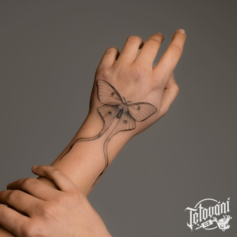 Tetování zvíře, můra na hřbetu ruky