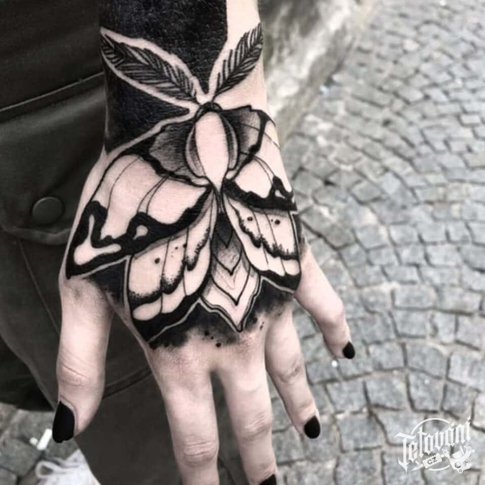 Tetování zvíře, můra na hřbetu ruky