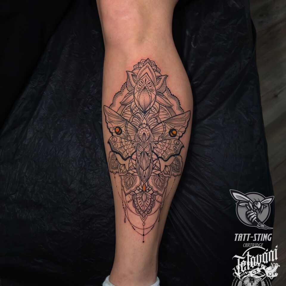 Tetování zvíře můra, ornamenty na lýtko