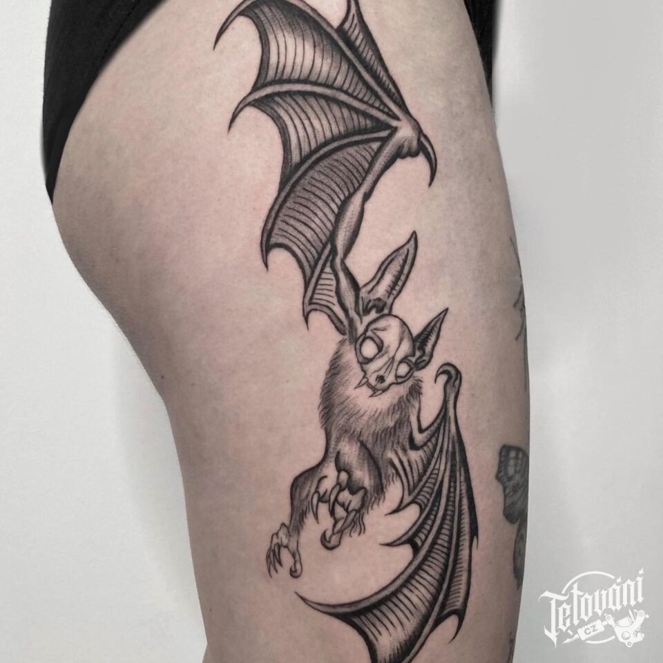 Tetování zvíře, netopýr na boku stehna