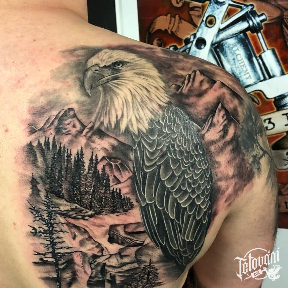 Tetování zvíře orel, příroda, hory les na lopatku