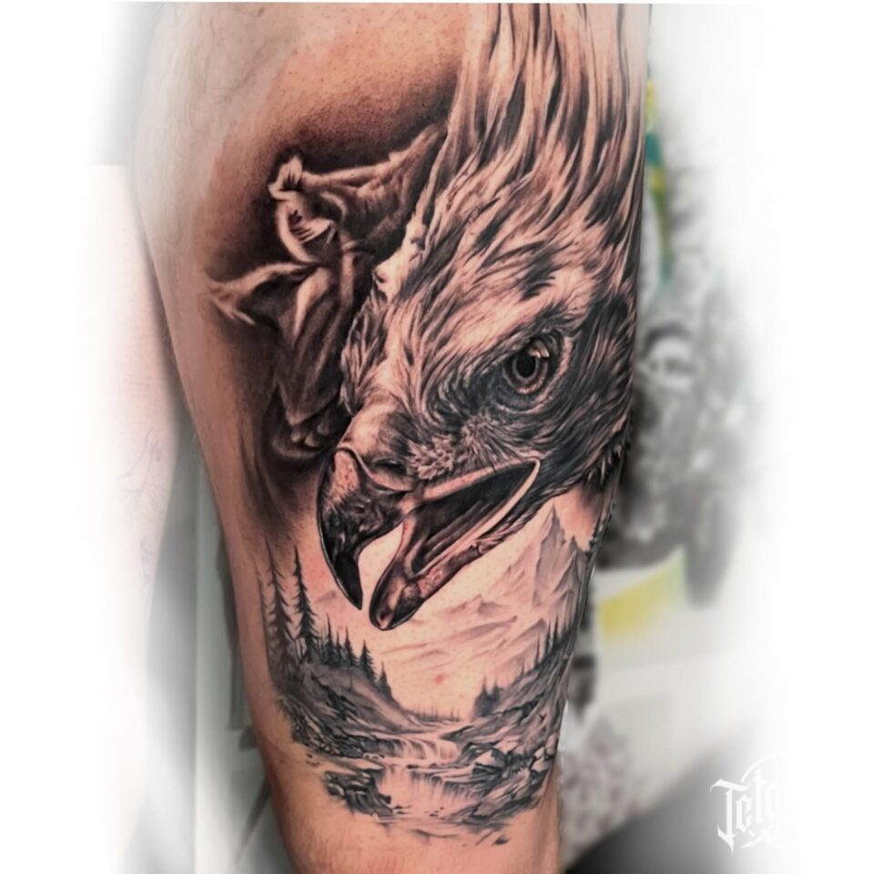 Tetování zvíře orel, příroda les, hory na stehno