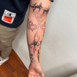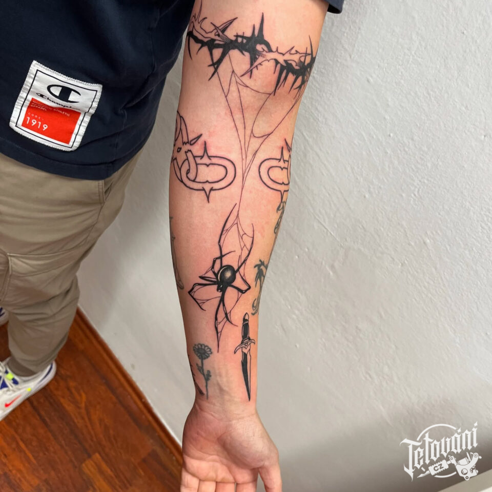 Tetování zvíře, pavouk s pavučinou, řetěz a ostnatý drát kolem ruky