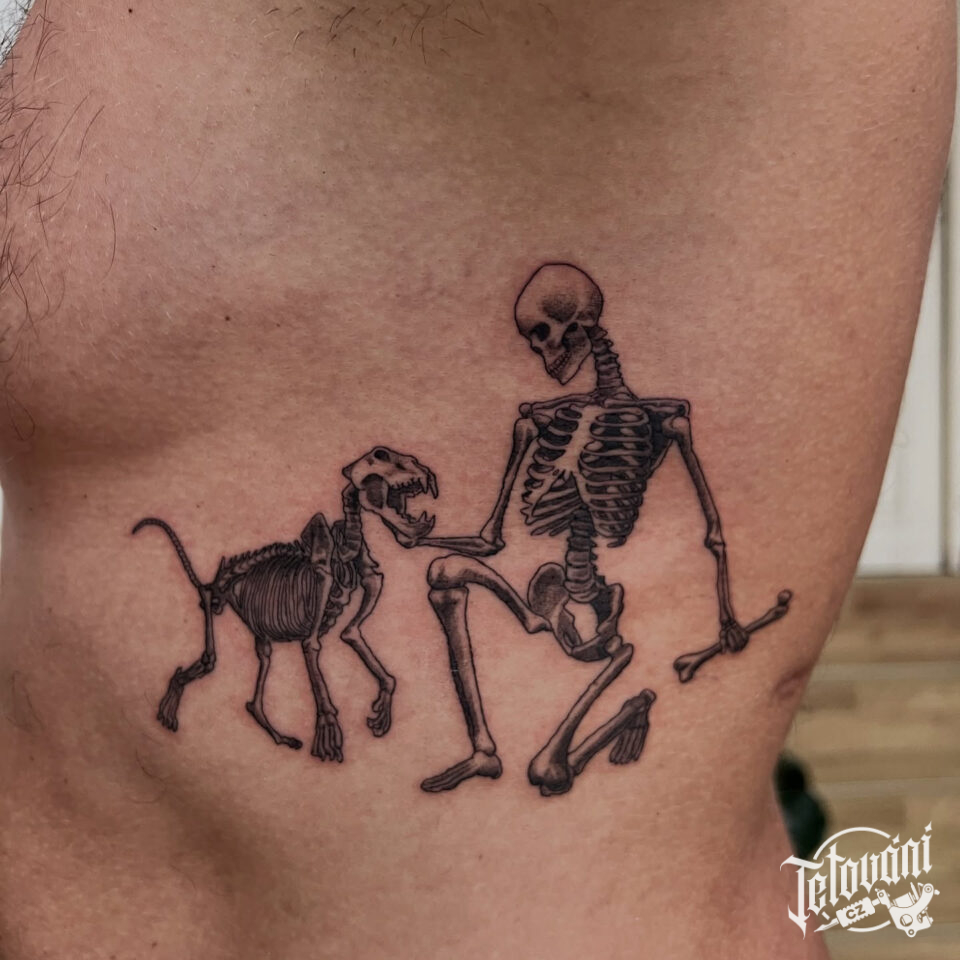 Tetování zvíře, pes a člověk kostlivec na žebrech