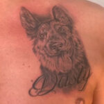 Tetování zvíře, pes a nápis, jméno na prso