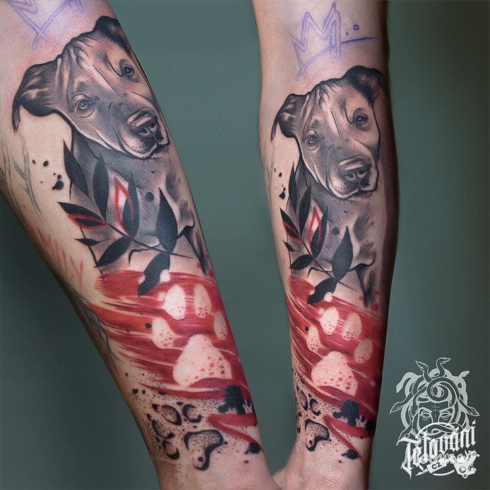 Tetování zvíře, pes a psí tlapky na předloktí