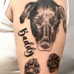 Tetování zvíře, pes a psí tlapky, nápis, jméno na rameni