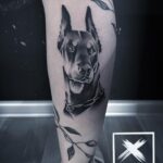 Tetování zvíře, pes, dobrman na lýtku