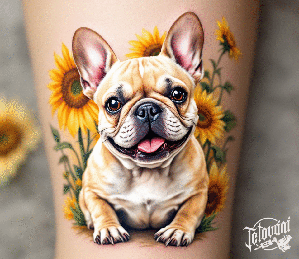 Tetování zvíře, pes, francouzský buldoček se slunečnicemi na lýtku