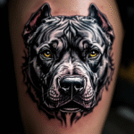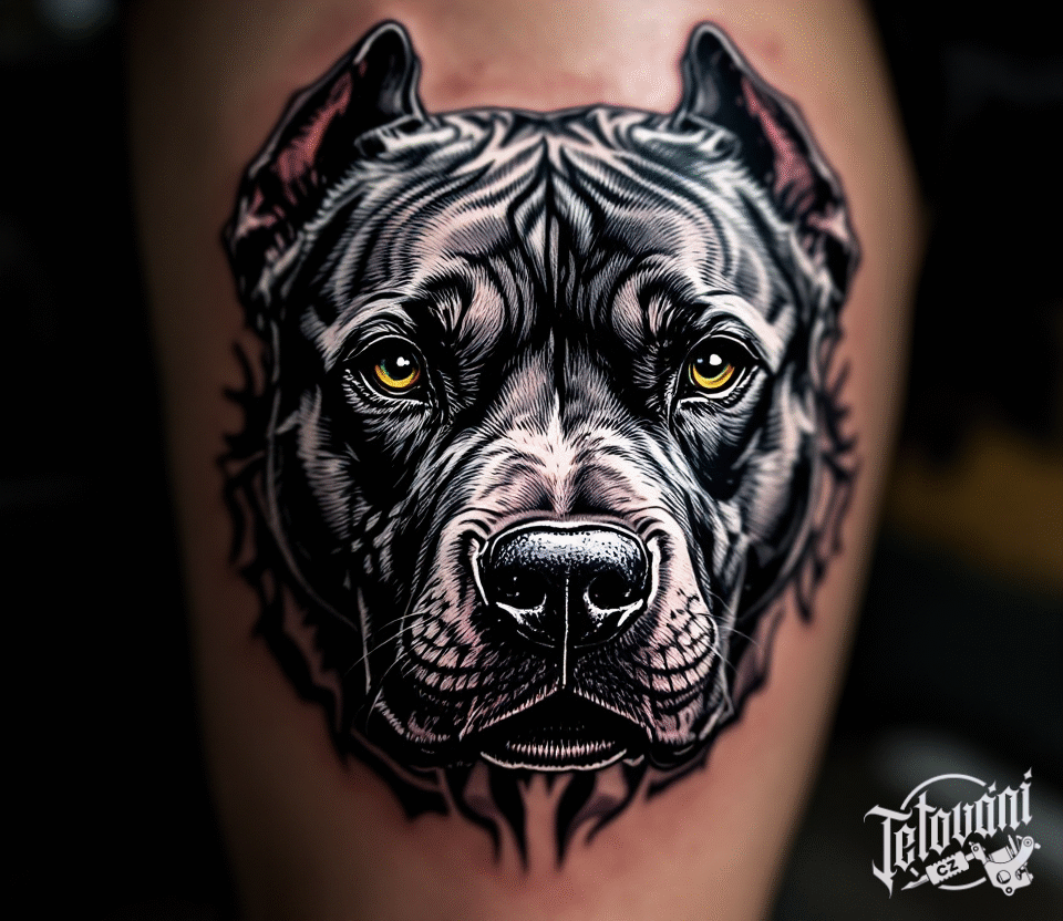 Tetování zvíře, pes, hlava pitbulla na stehně