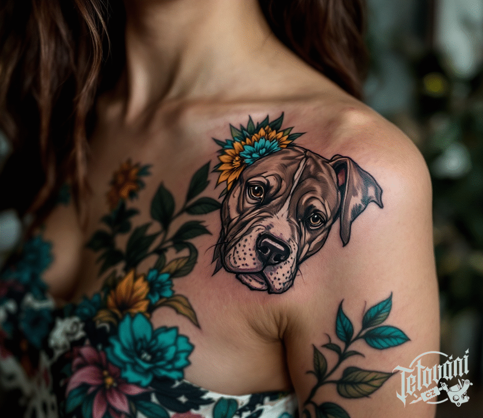Tetování zvíře, pes, hlava pitbulla pod klíční kostí