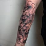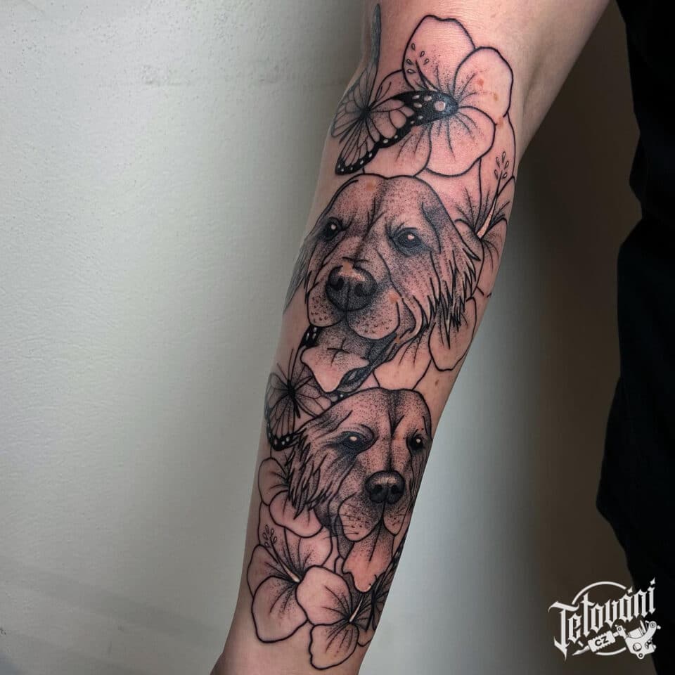 Tetování zvíře pes, květiny na předloktí
