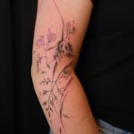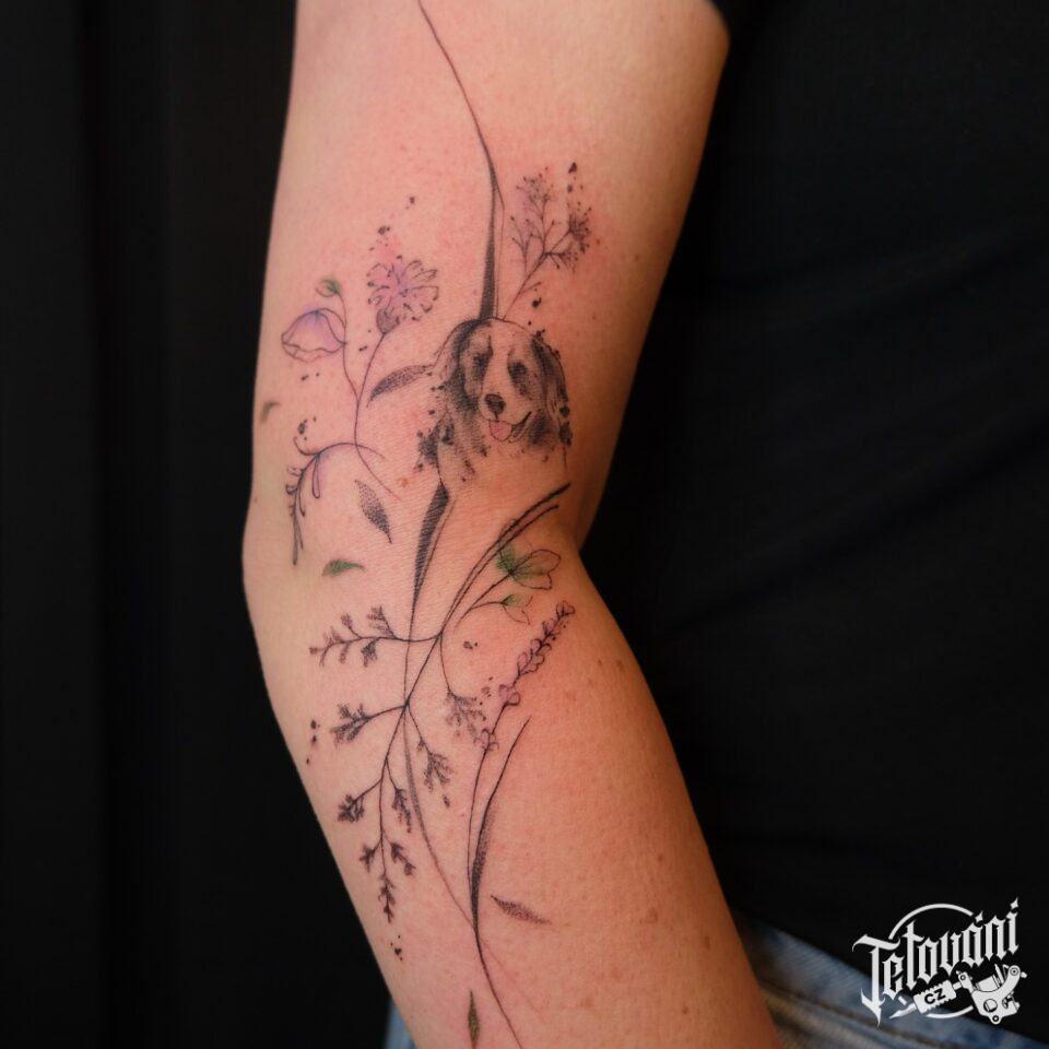 Tetování zvíře pes, květiny na ruku