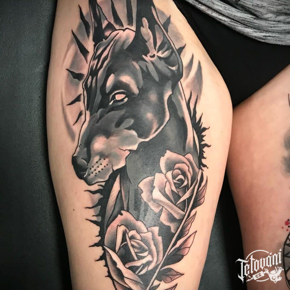 Tetování zvíře pes na stehno