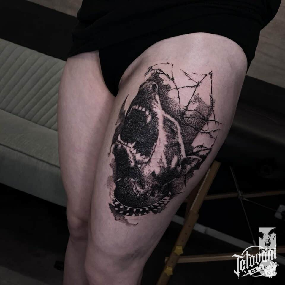 Tetování zvíře pes na stehno