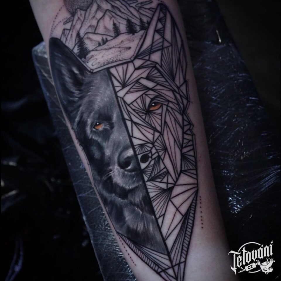 Tetování zvíře pes, portrét, tvary na předloktí