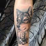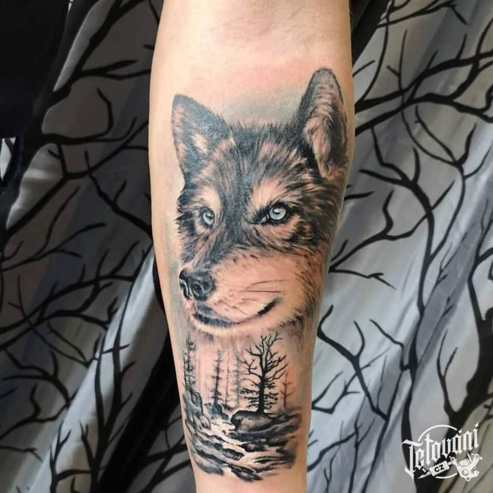 Tetování zvíře pes, příroda hory a les na předloktí