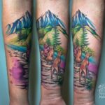Tetování zvíře pes, příroda hory na předloktí