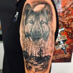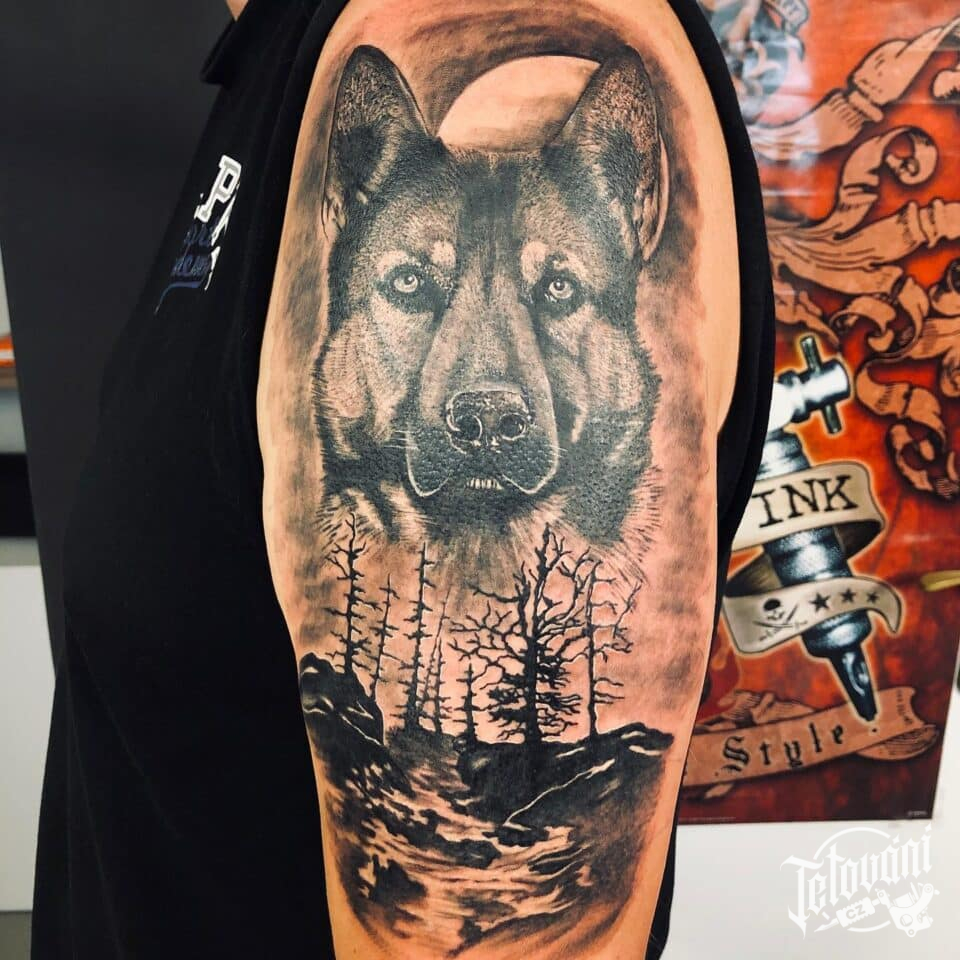 Tetování zvíře pes, příroda les na rameno