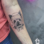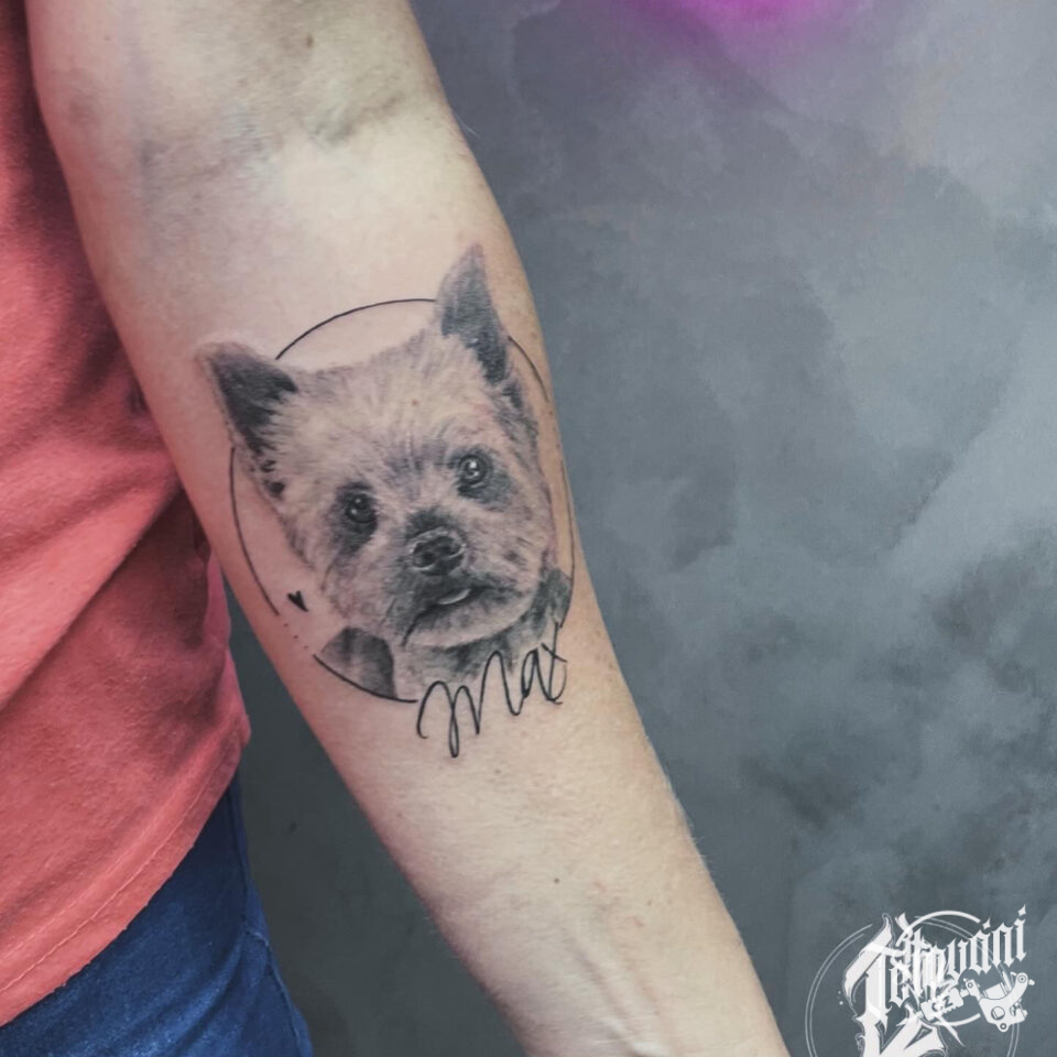 Tetování zvíře, pes se jménem na předloktí