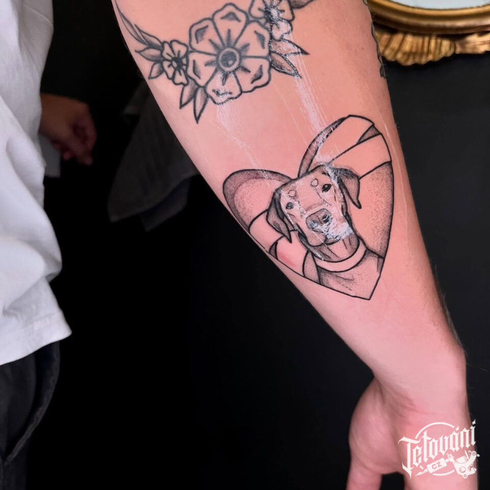 Tetování zvíře, pes se srdcem na předloktí